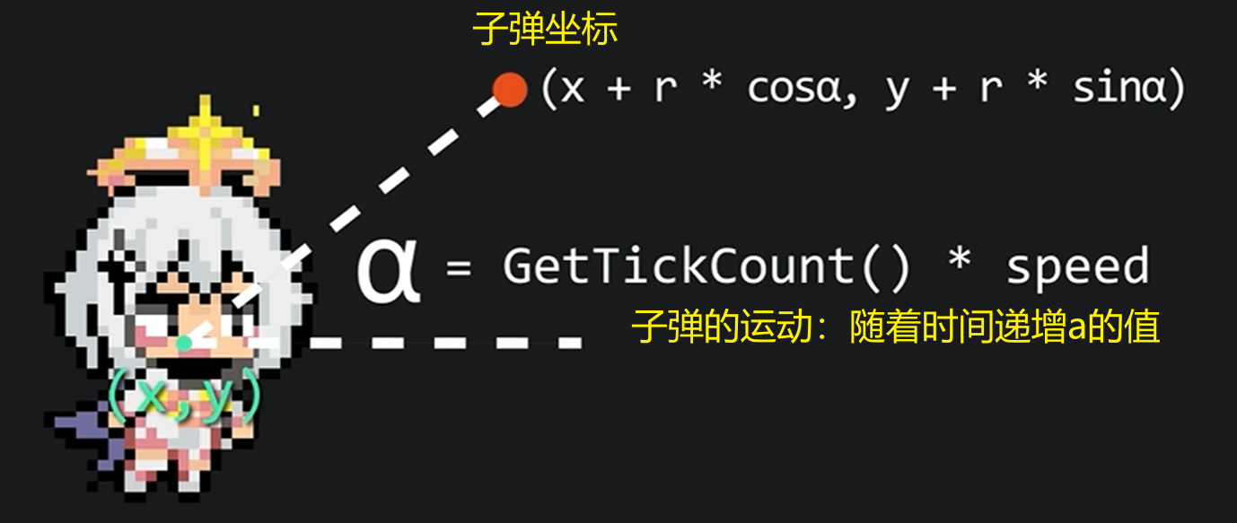 POINTplayer_position=player.GetPosition();doubleradius=BULLET_BASE_RADIUS+BULLET_RADIUS_CHANGE_RANGE*sin(GetTickCount()*RADIAL_SPEED);for(size_ti=0;i<bullet_list.size();i++){doubleradian=GetTickCount()*TANGENT_SPEED+radian_interval*i;bullet_list[i].position.x=player_position.x+player.FRAME_WIDTH/2+(int)(radius*sin(radian));bullet_list[i].position.y=player_position.y+player.FRAME_HEIGHT/2+(int)(radius*cos(radian));}}voidDrawPlayerScore(intscore){staticTCHARtext[64];_stprintf_s(text,_T("当前玩家得分:%d"),score);setbkmode(TRANSPARENT);settextcolor(RGB(255,85,185));outtextxy(10,10,text);}