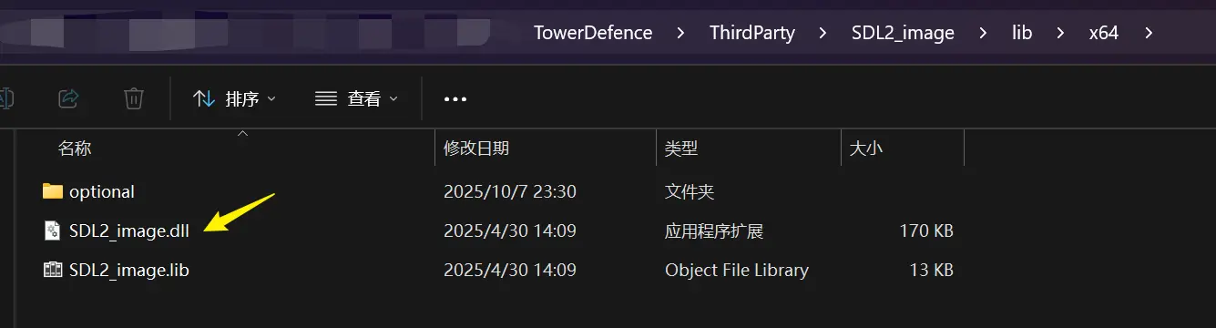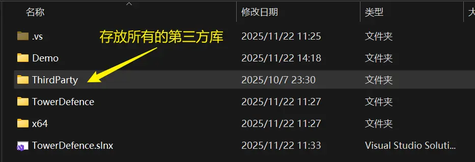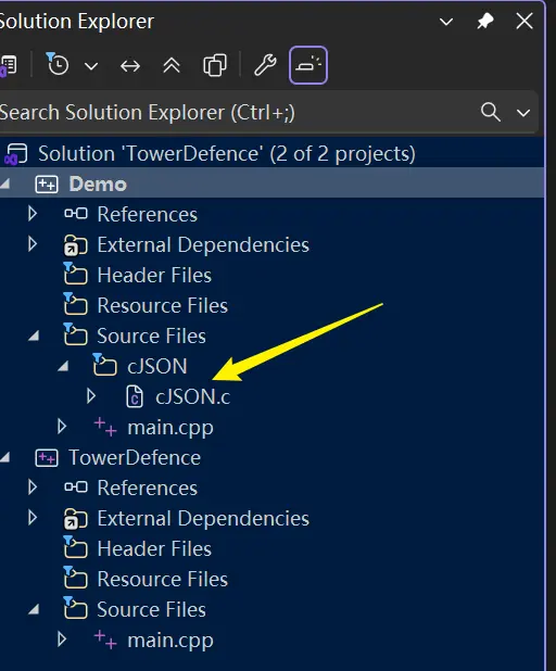 Place all SDL‑related files into a single folder to make future management easier. In the example below, the solution is named “TowerDefence”, and it contains two projects: “Demo” and “TowerDefence”.