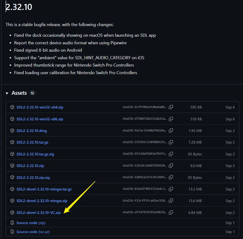 After opening the page, choose the version that matches your operating system. Since this project uses SDL2 (note that SDL3 is already available), select the latest release that starts with 2. As the project is developed with Visual Studio, download the corresponding version listed below.