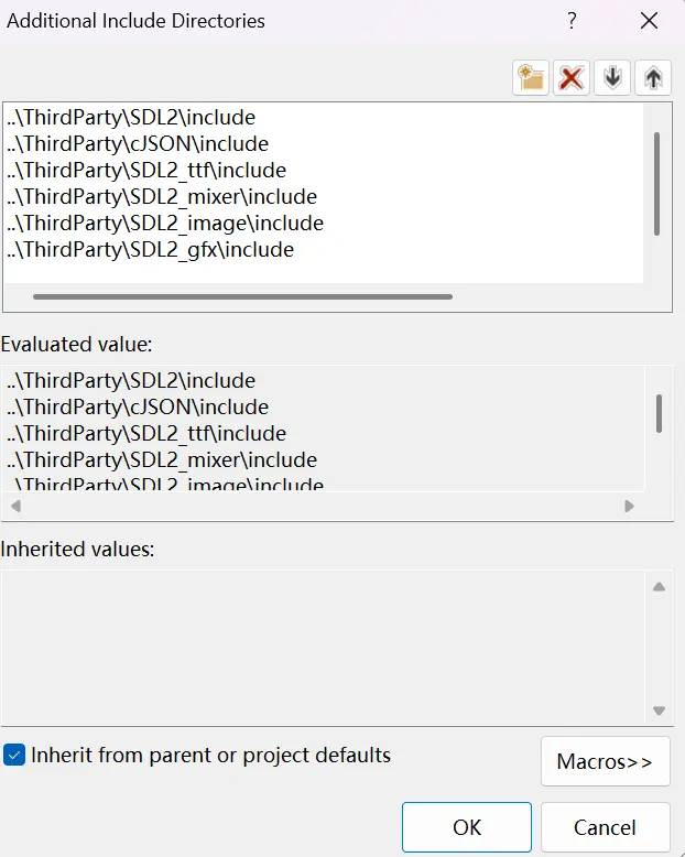 Open the Properties window in the same way as before. Go to C/C++, and in the first line on the right, add the relevant SDL header files. Note that by default, Visual Studio uses absolute paths when adding files. For flexibility, change them to relative paths: