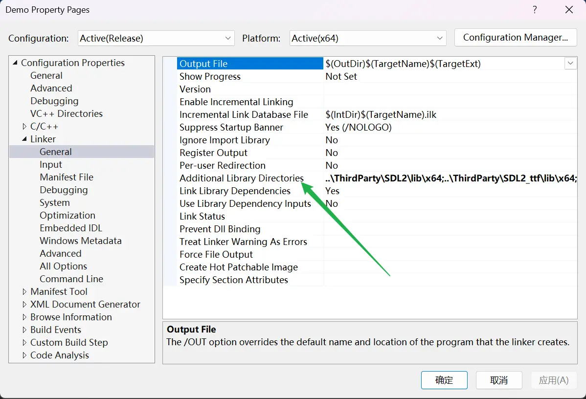 Again, open the Properties window. Go to Linker → General, and on the right side locate Additional Library Directories.
