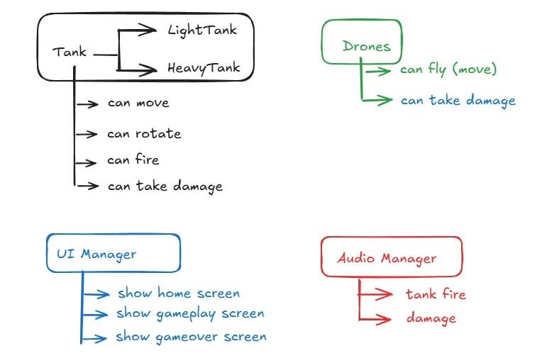 Tank functionalities like movement, shooting, rotation, and health are split into independent components instead of being lumped into a massive “Tank” class. This is a classic example of SRP in practice.