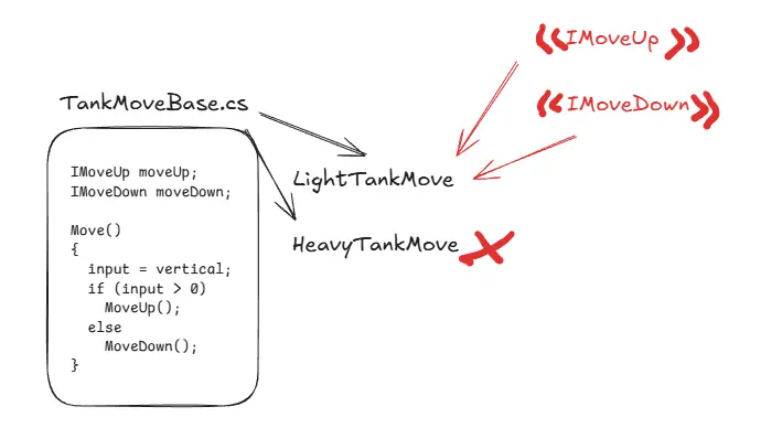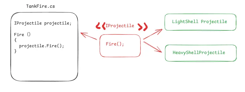 TankFiredepends on theIProjectileinterface to launch ammo, not on specific ammo classes.TankMoveBasecasts itself to an interface (this as IMoveY) for calls, ensuring high-level logic depends on abstractions rather than concrete implementations.