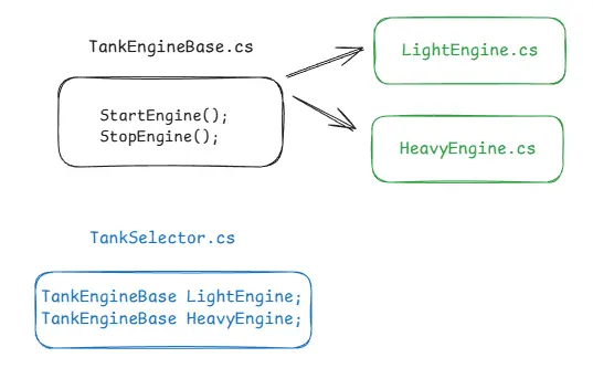 TankEngineBase(TankEngineLight,TankEngineMedium,TankEngineHeavy) can be used interchangeably withinTankEngineSelectorandGameMgr. GameMgr.CheckEngine()iterates through aList<TankEngineBase>and callsGetStatus(), remaining unaware of the specific engine type.- Similarly, subclasses of