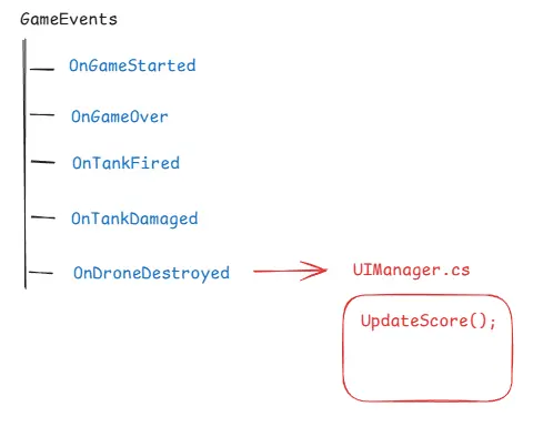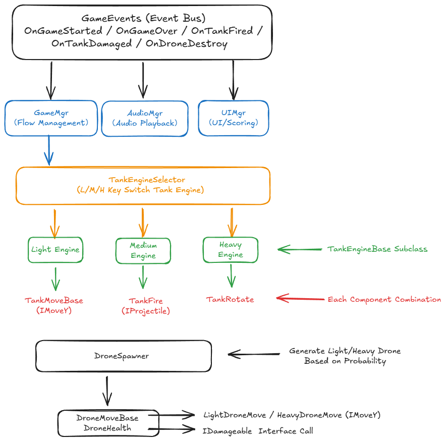 This is the final application of the Dependency Inversion Principle (DIP) mentioned earlier. Since both projectiles and drones are destroyed upon collision, they don’t directly implement the IDamageable interface. Instead, the tank’s health system implements the interface. This way, even if new projectile types are added in the future with different damage values, they can be easily integrated. For drones or other enemy types, if different damage behaviors are needed, they can also be flexibly designed by inheriting from the interface.
