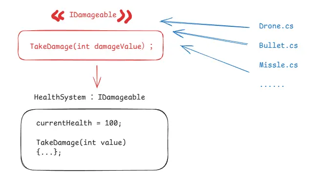 遵循依赖倒置原则(DIP),使用一个 IDamageable 的接口来和具体的类交互。这个具体的类可以是飞机、也可以是其他的碰撞物,如子弹、导弹等。