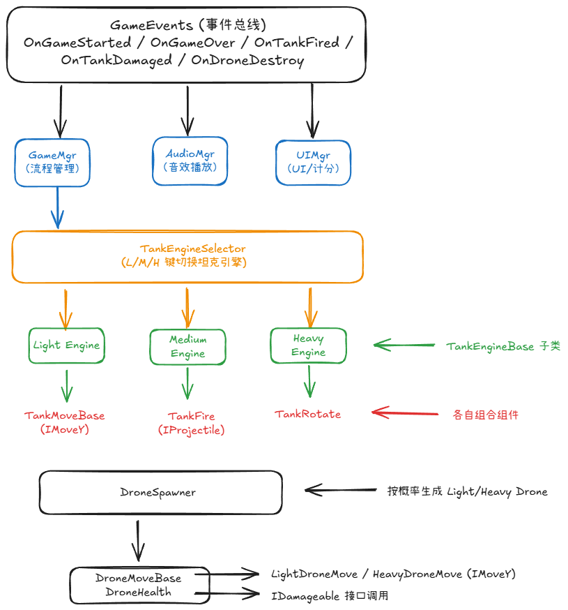 | Tank/Engine | 坦克引擎切换系统,玩家可通过 L/M/H 键切换不同类型坦克 | TankEngineBase → TankEngineLight/Medium/Heavy,TankEngineSelector |